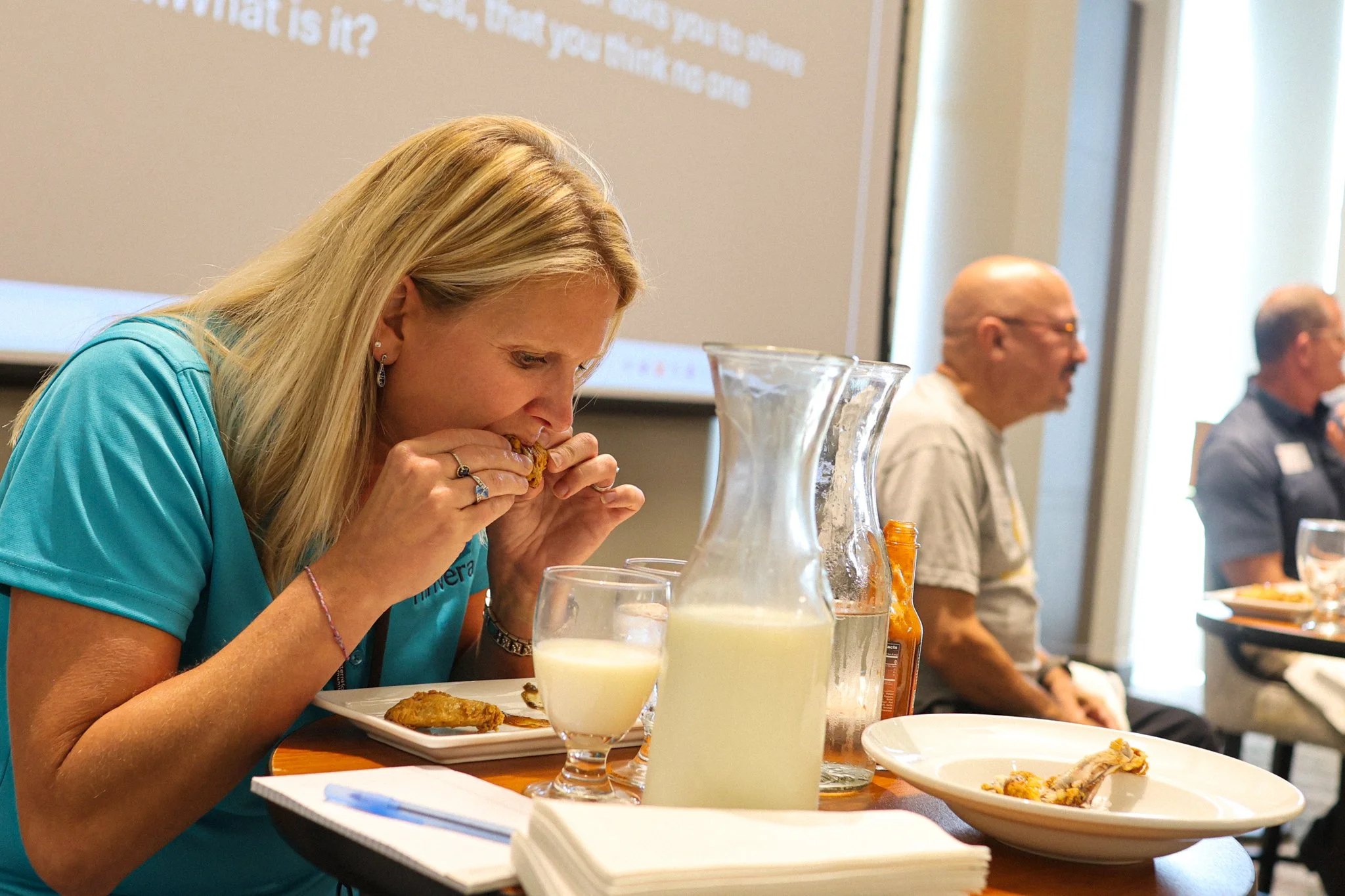Erika Kramer, Senior Director of Thrivera, takes a spicy bite before answering the question.