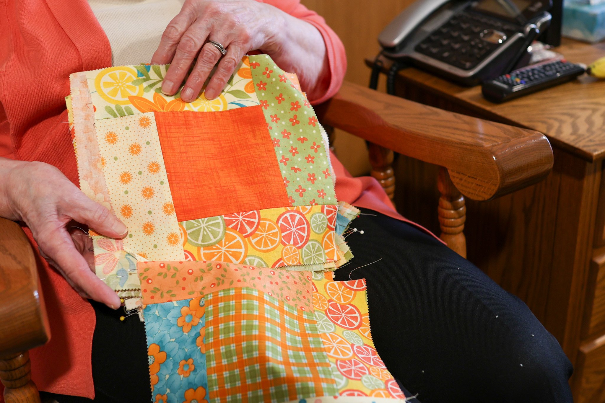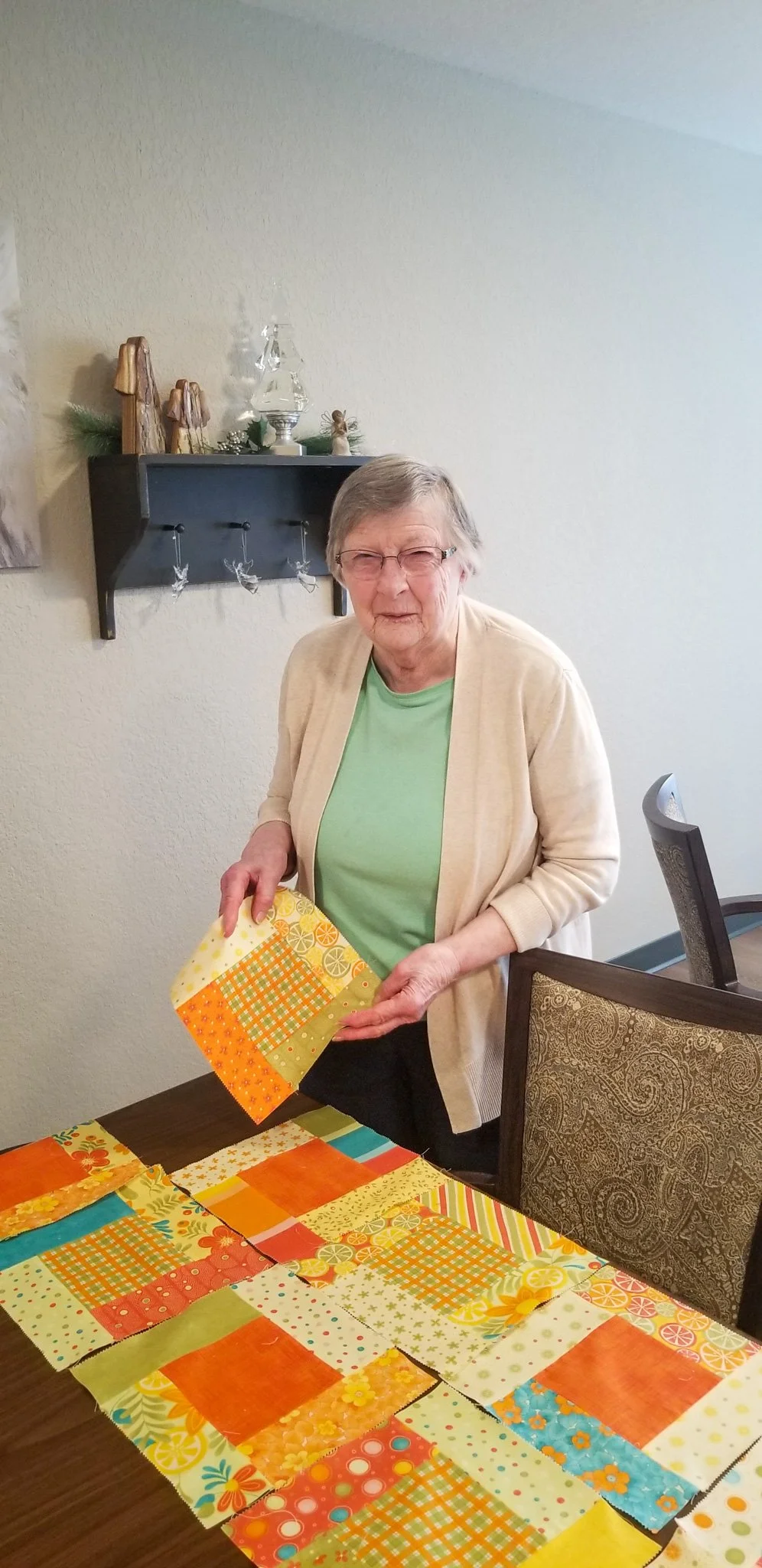 Her daughter, Cyndi Craigmile, explained that the orange squares were a project Norma started years ago—something that surfaced during a move. “I found it when we moved her over here,” she said. Norma commenting at the obvious, “orange is my favorite color.” Soon enough, that “undone” stack will likely turn into a couple quilts.